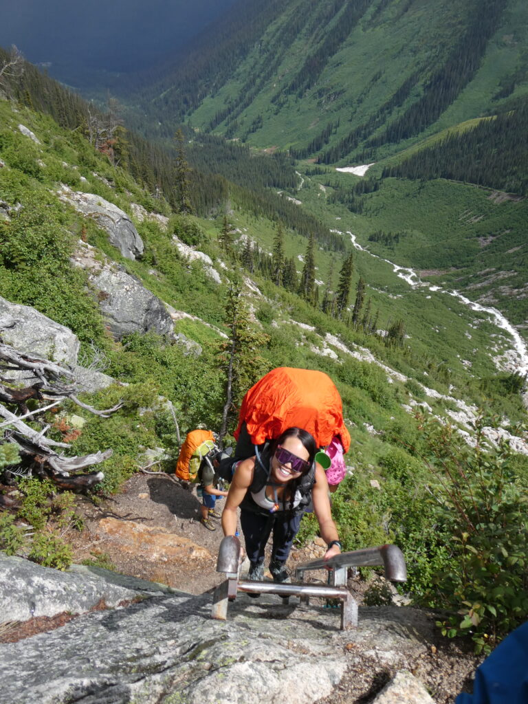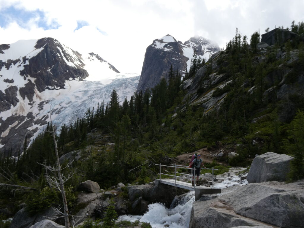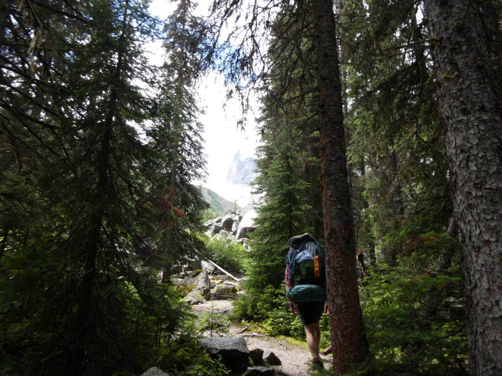 After parking the car, we put barriers up to prevent the porcupines eating our tires. We had pre-packed our backpacks with food, fuel, camping and climbing gear, with the weight coming in at a hefty 26kg. We began walking from the trailhead towards the Applebee campground around midday, and were greeted with ever improving views of the granite and glaciers as we emerged from the lush valley forest.