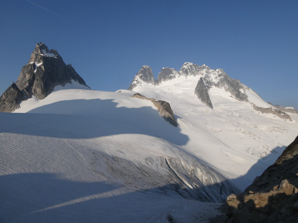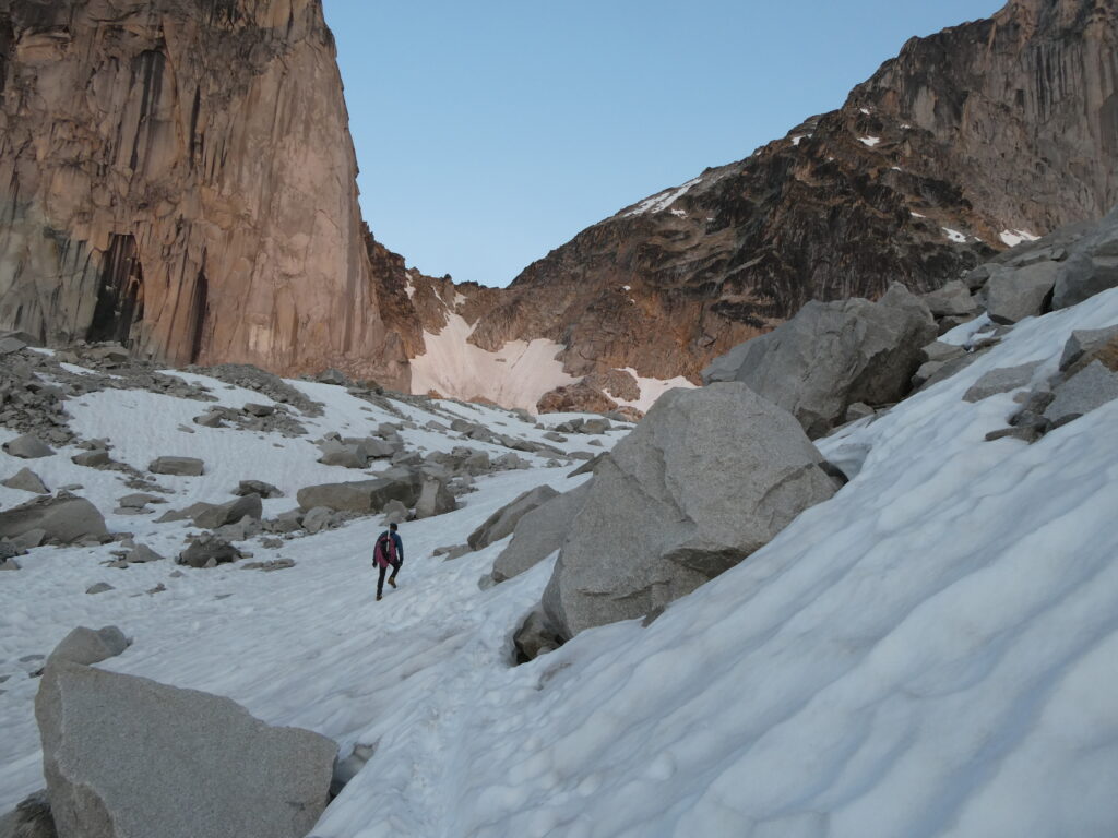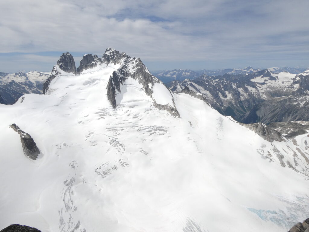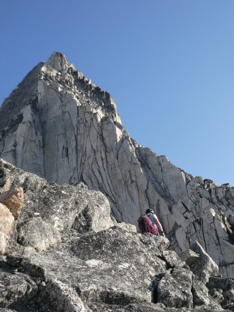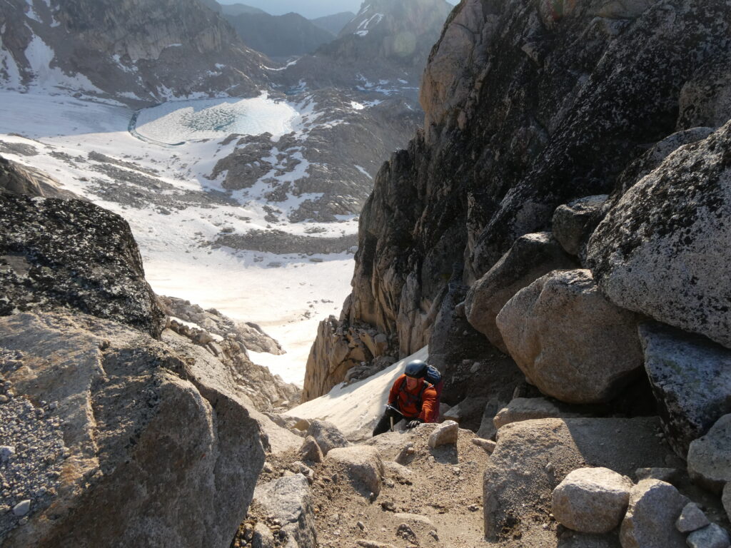 We reached the col after 1.5 hours, and were greeted with spectacular views of Pigeon Spire and the South Howser Towers across the Vowell Glacier.