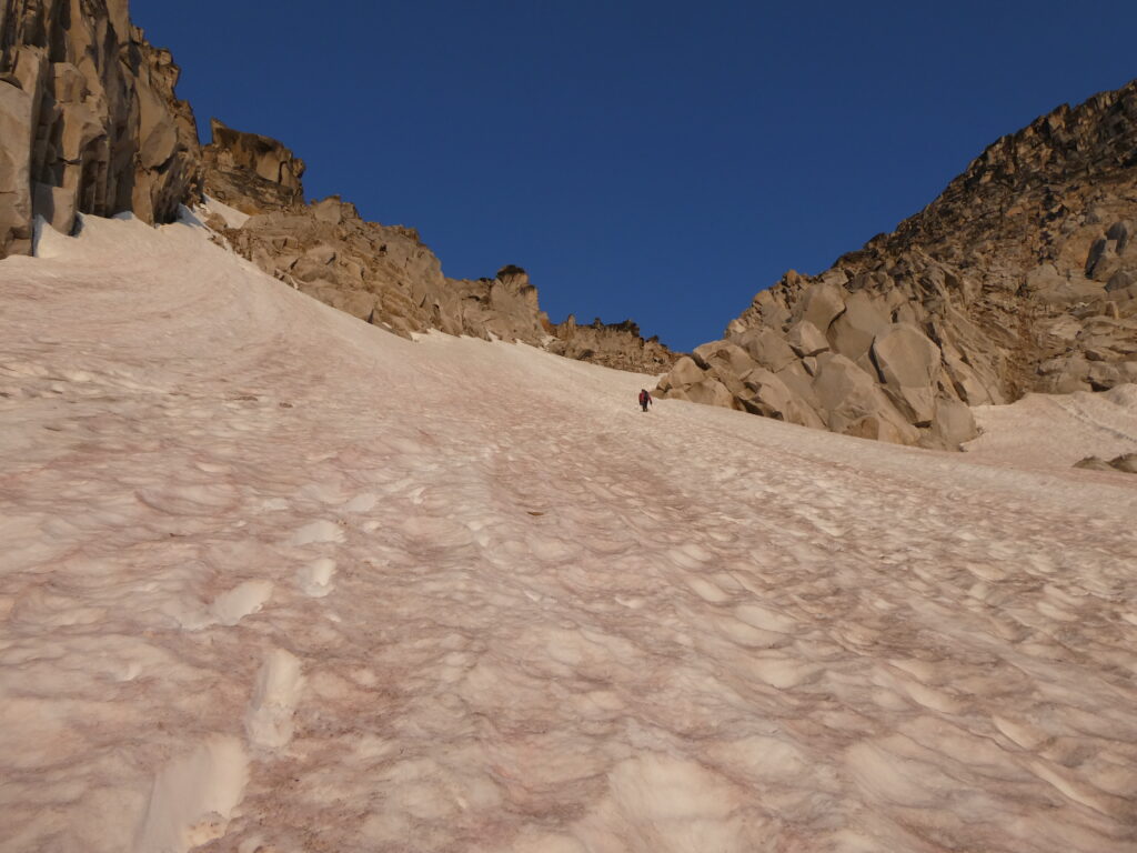 We set our alarms for 5am, and after a quick breakfast we were off marching towards the Snowpatch-Bugaboo col at 5:45am. The sky was clear, there was no wind and the snow was firm, which made for pleasant cramponing up the snow slope of the col.