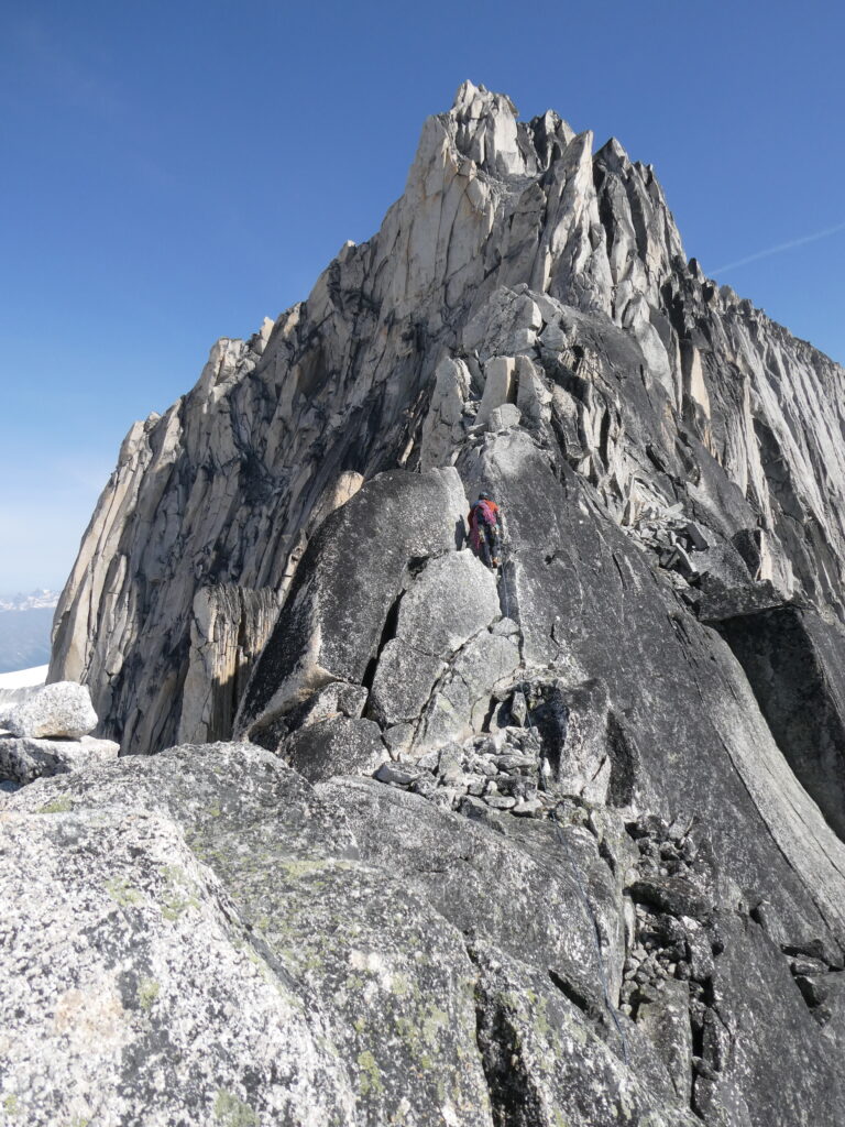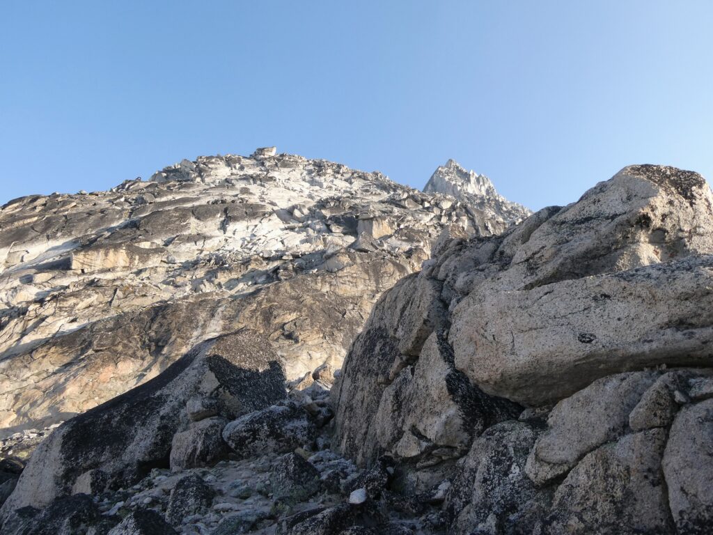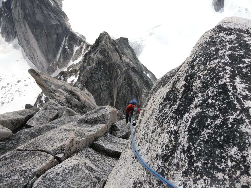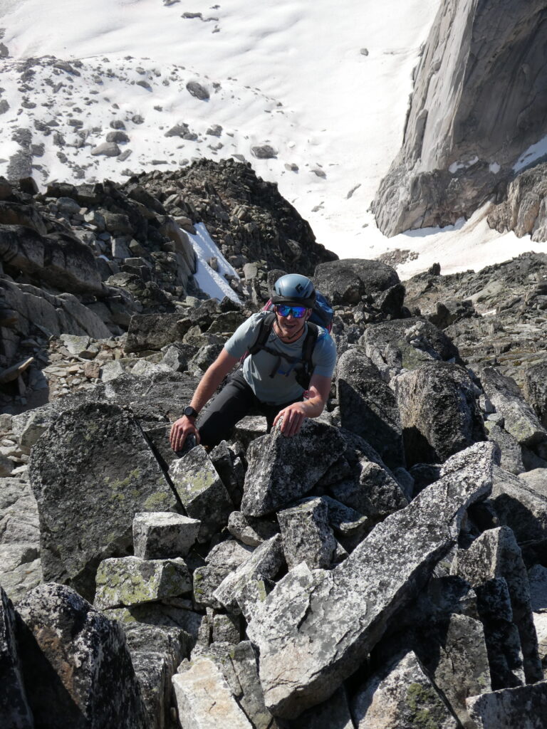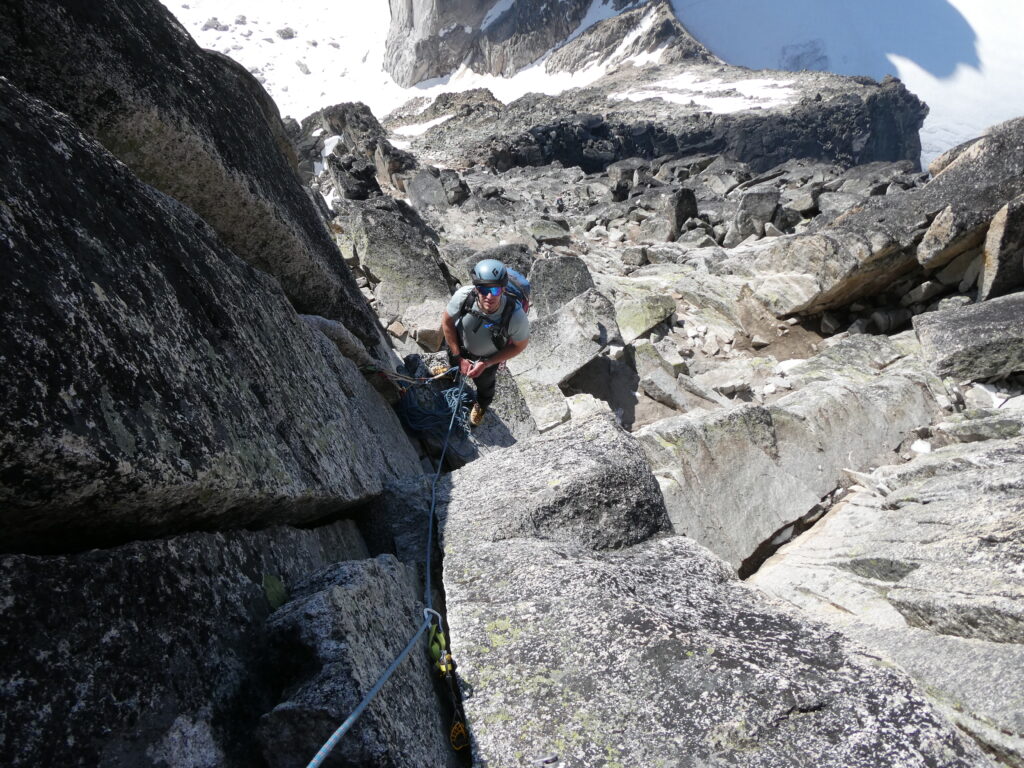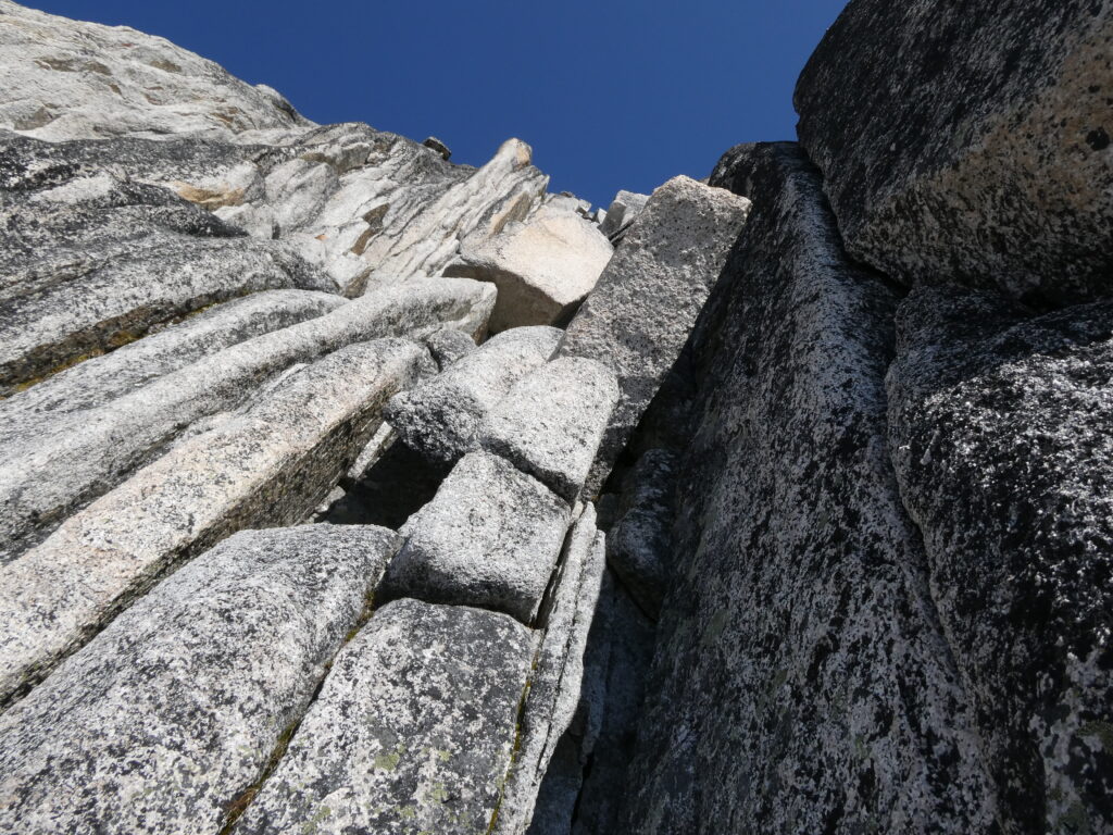 Most of the scrambling followed a broad ridgeline that wasn’t too exposed. Eventually, we reached the start of the technical climbing – a 5.4 ‘chimney’ which I lead in my mountain boots. It felt more strenuous than 5.4 with some jamming required.