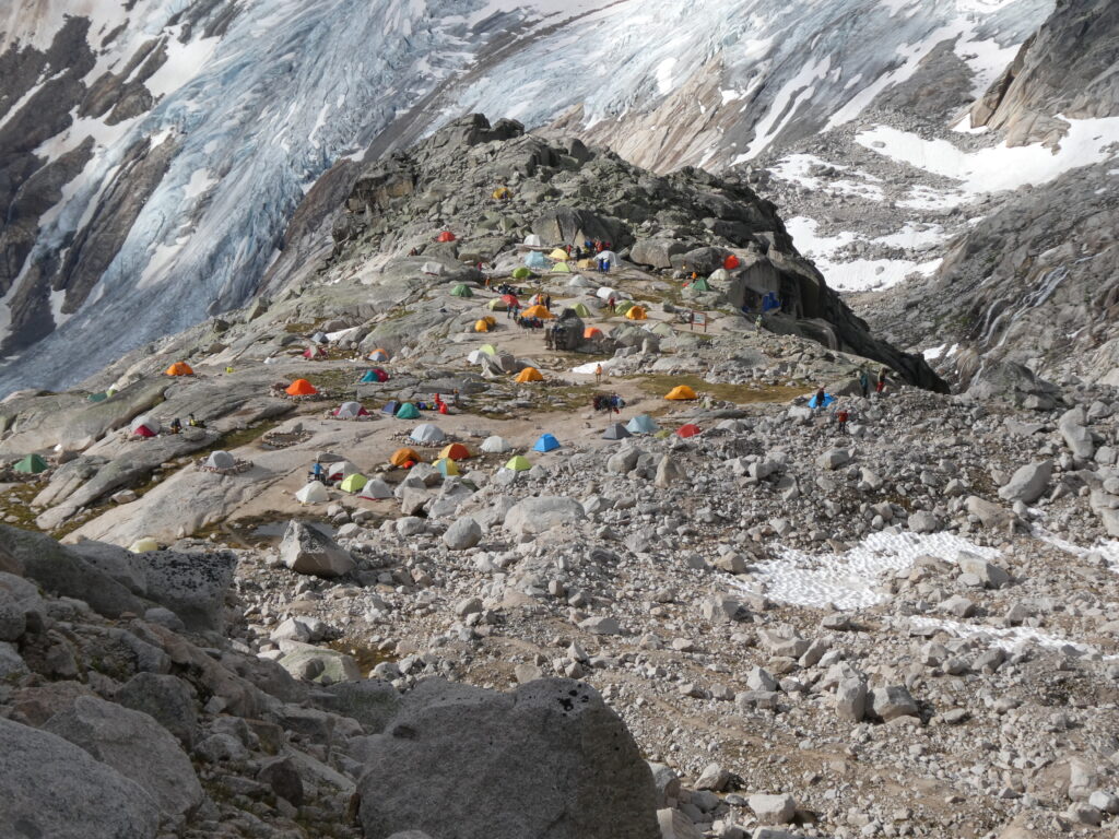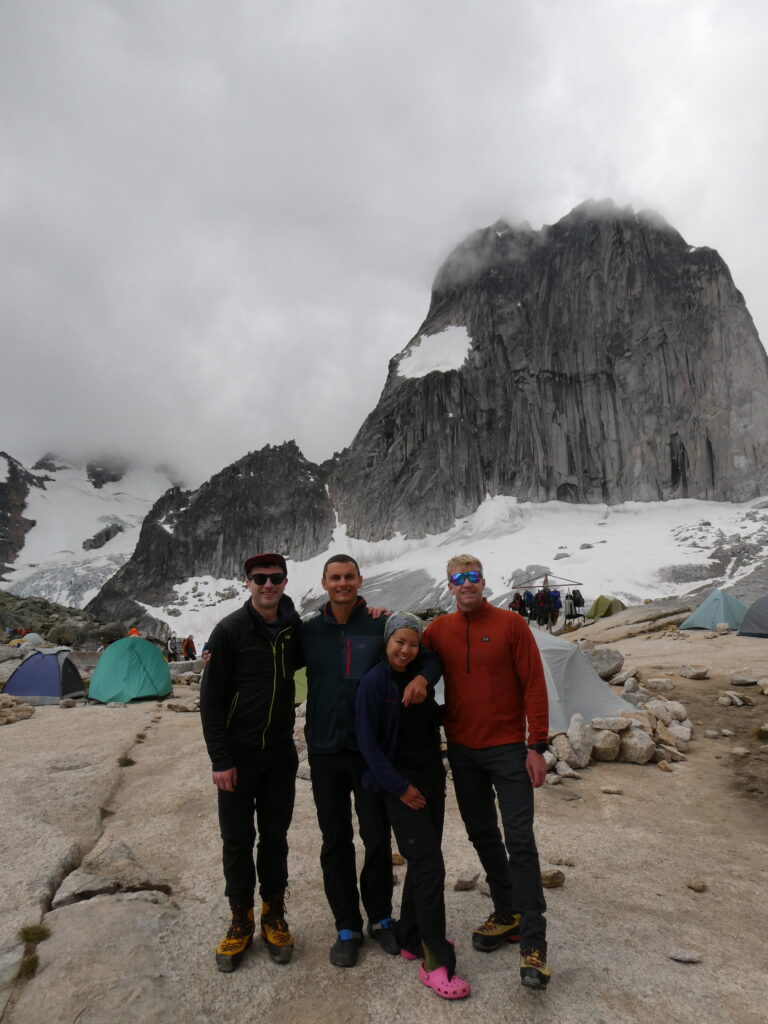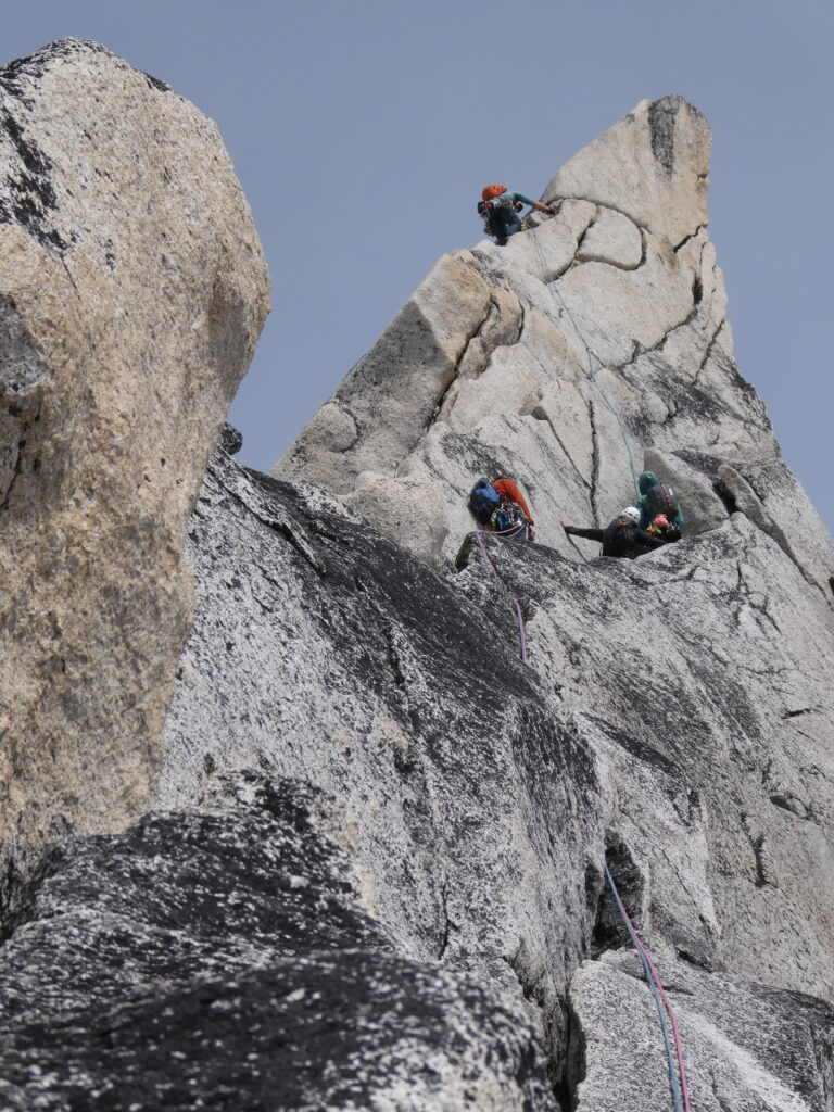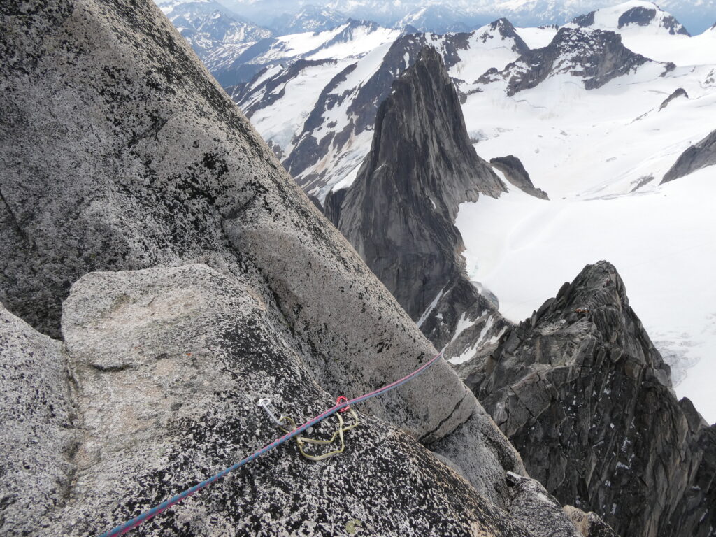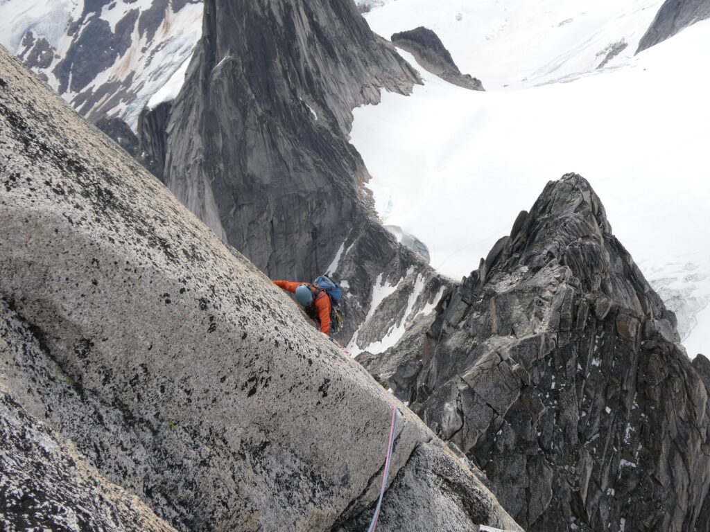 The protection was generally good, and the climbing wasn’t too difficult. However, the exposure was absolutely wild. There is a section of slab climbing with no hands, below which 500m of air drops away to the glacier below. Getting to the anchor point was a relief.